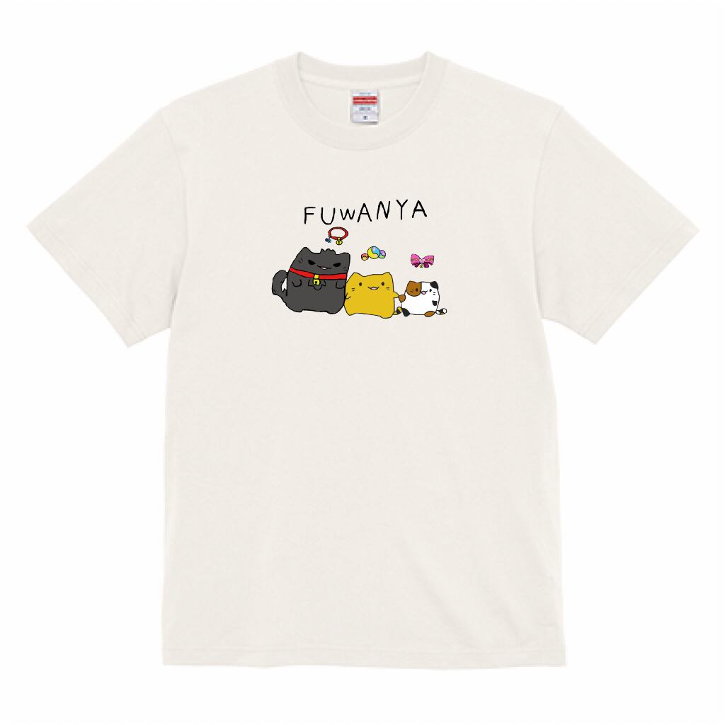 「ふわにゃ」と「くろねこちゃん」「みけちゃん」の3兄妹と、それぞれのシンボルアイテムが一緒にデザインされたオリジナルTシャツです。
