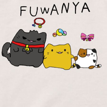 「ふわにゃ」と「くろねこちゃん」「みけちゃん」の3兄妹と、それぞれのシンボルアイテムが一緒にデザインされたオリジナルTシャツです。